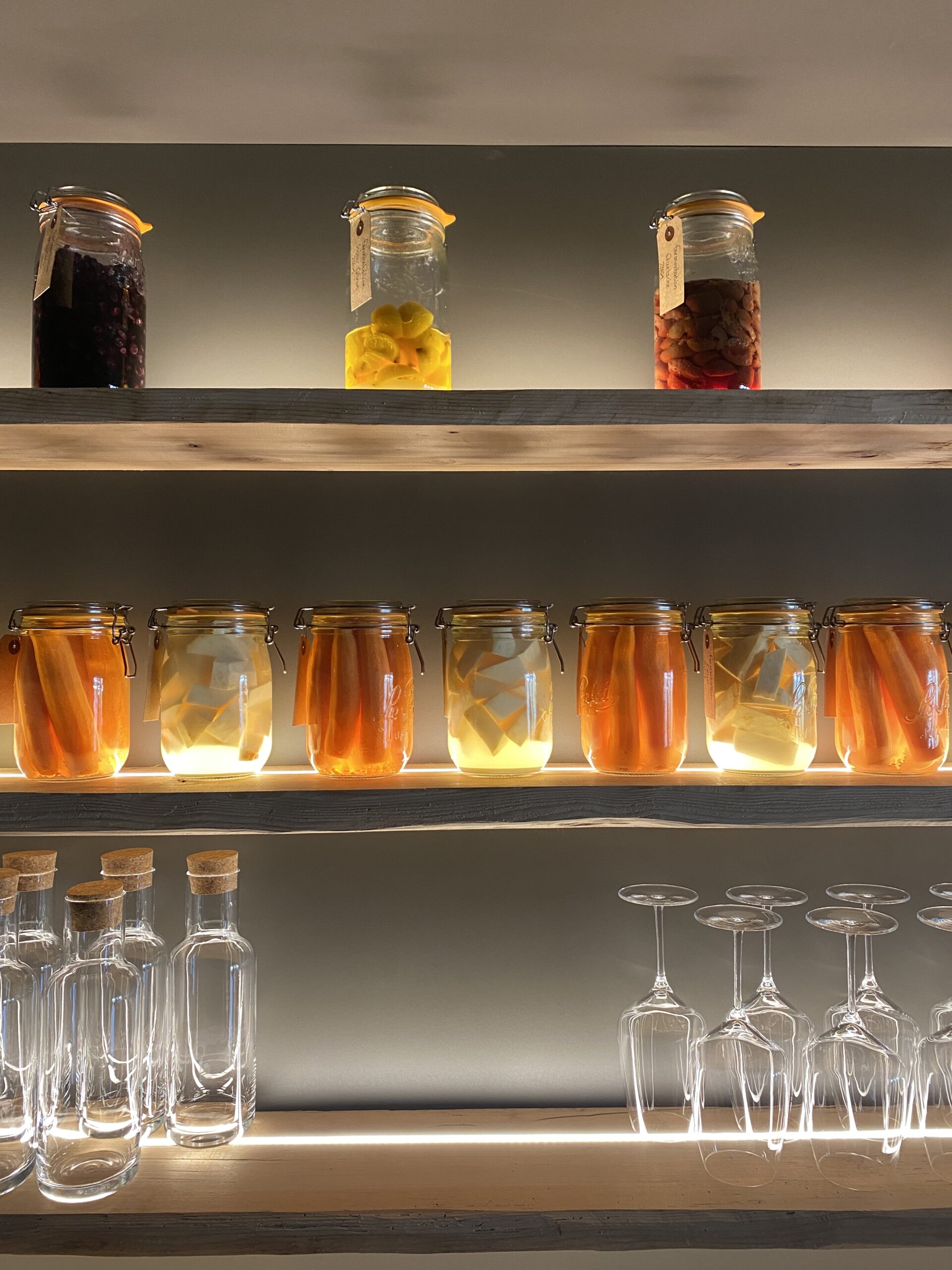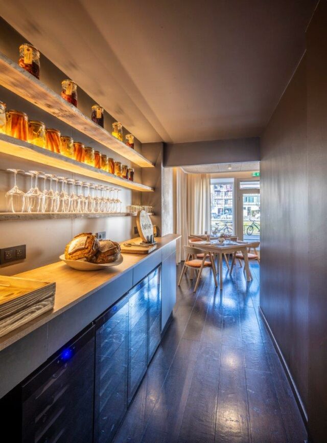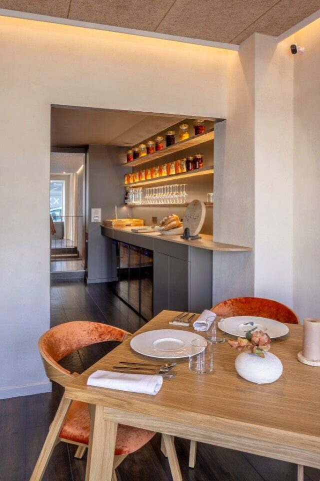 Cette matérialité assumée entre en résonance avec la cuisine proposée, dans laquelle le produit est toujours identifiable et jamais masqué. De la même manière que les assiettes expriment l’origine et la transformation des ingrédients, l’espace révèle ses assemblages, ses jonctions et ses logiques constructives. Loin de rechercher une perfection lisse, le projet valorise une forme de justesse artisanale qui inscrit le lieu dans une temporalité vivante.