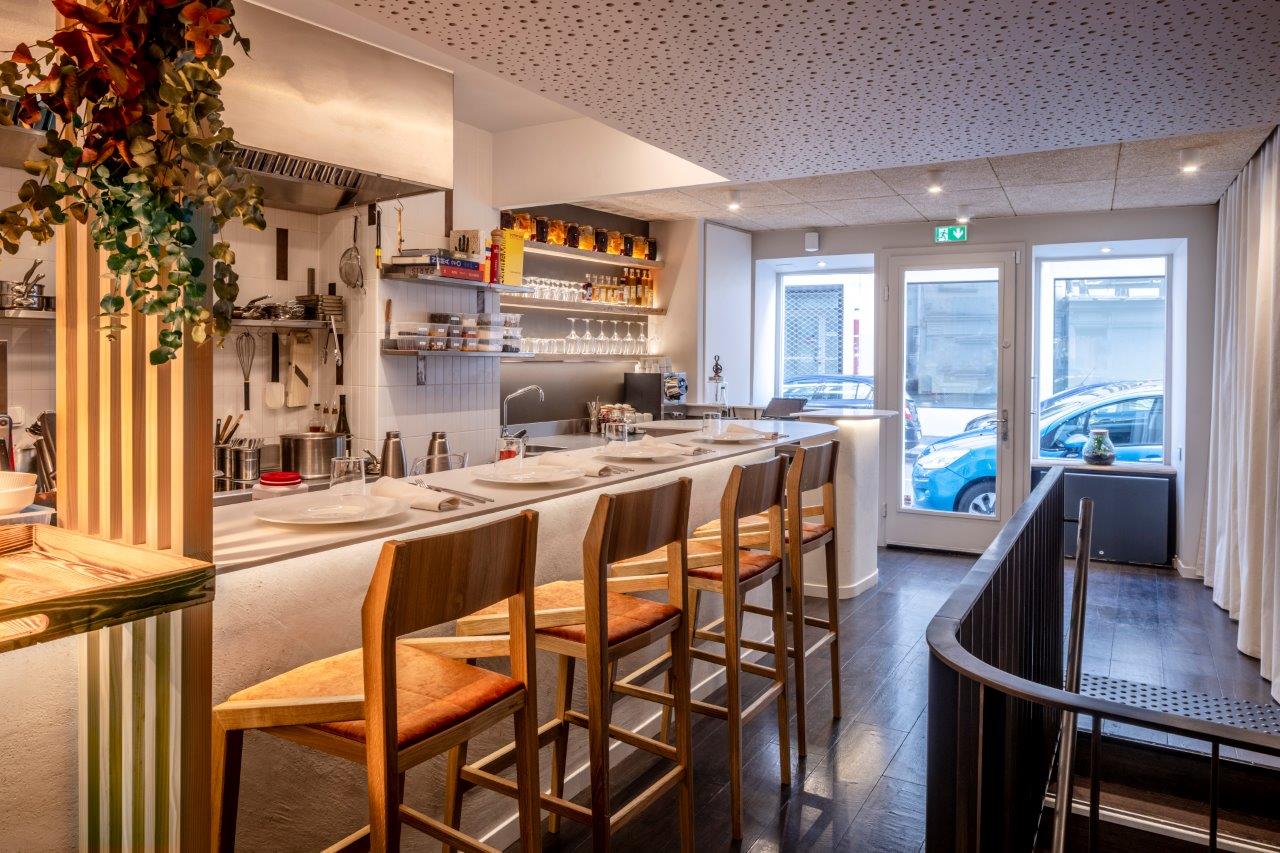 Le restaurant s’organise ainsi autour d’un principe fondamental : faire de la cuisine le cœur visible du projet. Loin d’être dissimulé, l’espace de préparation devient un véritable point d’ancrage autour duquel s’articulent les usages et les perceptions. Cette centralité ne relève pas d’une volonté spectaculaire, mais d’un désir de créer une continuité entre l’acte de cuisiner et l’expérience du convive. Le lieu se construit dès lors comme un dispositif relationnel, dans lequel les frontières traditionnelles entre production et dégustation s’estompent au profit d’une lecture plus fluide et plus honnête.