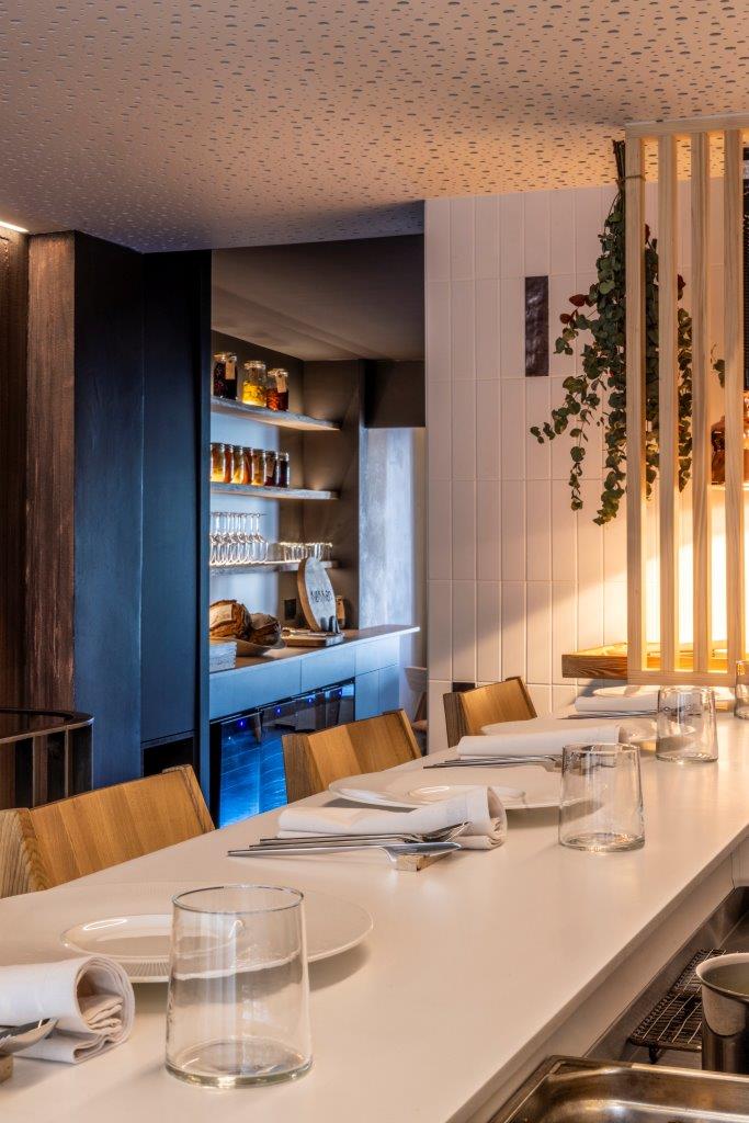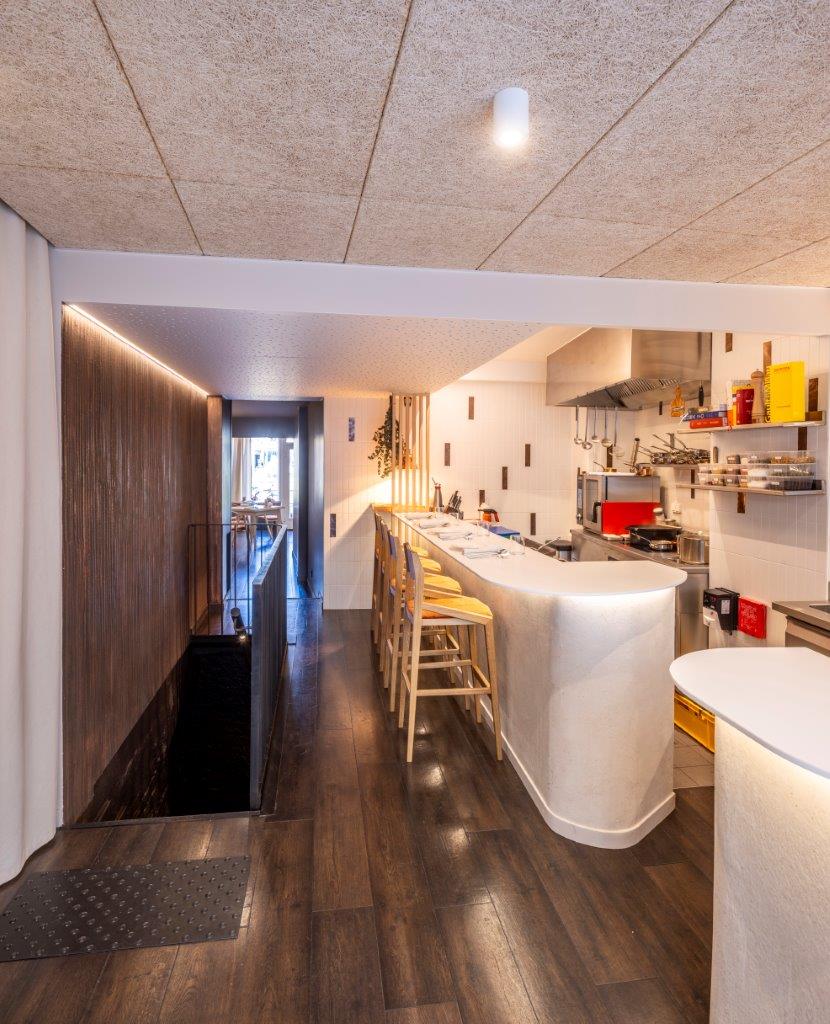 L’acoustique a également fait l’objet d’une attention particulière, afin de préserver la qualité des échanges et le confort des convives dans un environnement où la cuisine reste perceptible. Le projet cherche à maintenir une proximité sensible entre les usagers et le travail culinaire, sans générer de tension ni de saturation sonore.