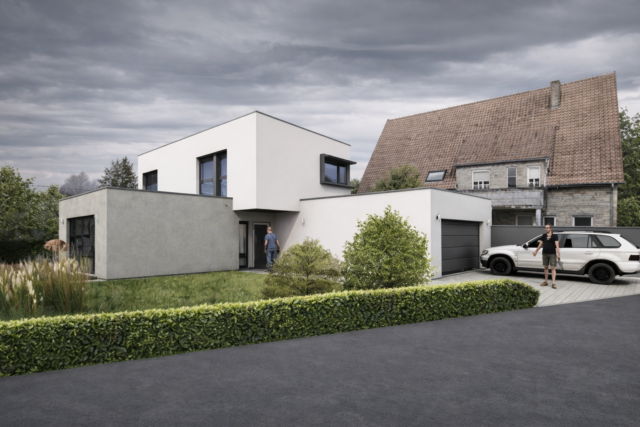 Construction d’une maison individuelle composée d’un salon, d’une cuisine avec espace repas, et d’un étage avec 3 chambres et SdB.